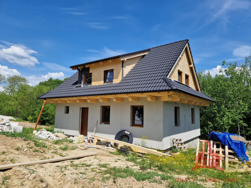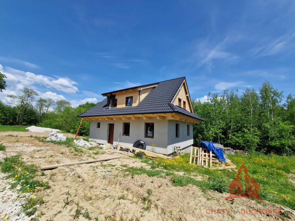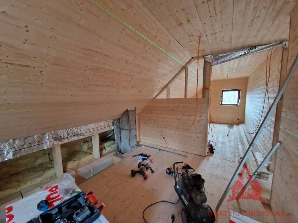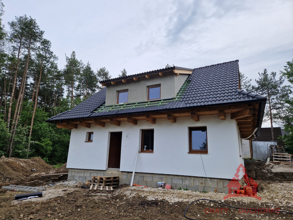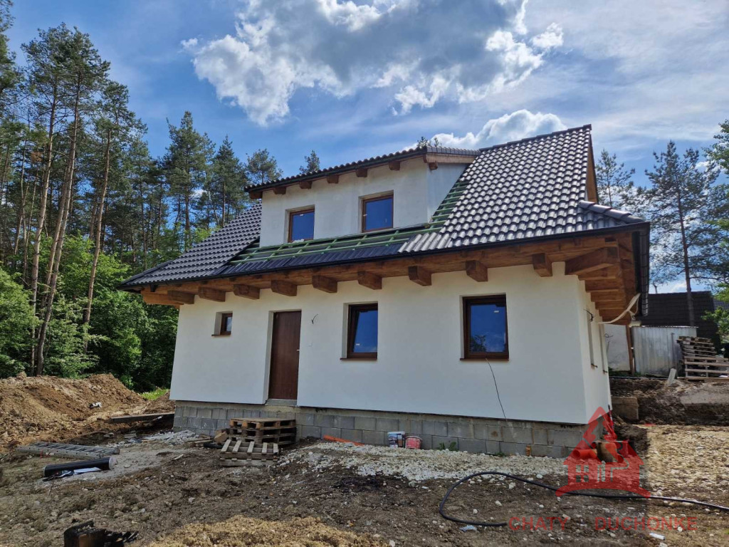 V rekreačnej oblasti DUCHONKA (okres Topoľčany) ponúkame na predaj 3 novostavby, ktoré sú toho času vo výstavbe. Keďže sú vo výstavbe, tak je možné v tejto chvíli ešte dolaďovať konečnú podobu a výbavu chaty. Chaty majú rovnaký projekt a dispozícia chaty je následovná. V suteréne chaty sa ráta s veľkým otvoreným priestorom, kde bude spoločenská miestnosť – obývačka, ktorá bude prepojená s kuchyňou. Na prízemí bude kúpeľňa so sprchovacím kútom, wc a umývadlom. V podkrovnej časti chaty budú 3 alebo 4 izby a samostatné wc. Stavby budú štandardne napojené na elektriku, miestny vodovod a odpad bude vo forme žumpy. Okná sú plastové, budú zateplené polystyrénom, strešná krytina je škridla. Chaty sú nateraz predávané ako holodomy, t.j. Podlahy, obklady, dlažby, sanita, krbové kachle sú v cene (individuálne je možnosť inej formy kúrenia, el. ústredné podlahové či radiátorové a samozrejme tiež meniť aktuálne dispozičné riešenie chaty, ako aj farebné prevedenie). V cene nie je zahrnutá kuchynská linka so spotrebičmi a vonkajšie terénne úpravy. Výmera pozemkov 378 m2, 398 m2 a 496 m2. Zastavaná plocha chaty je 9,7 x 7,2m = 70 m2 a čistá obytná plocha chaty je 120 m2. Mám kľúč od nehnuteľnosti.