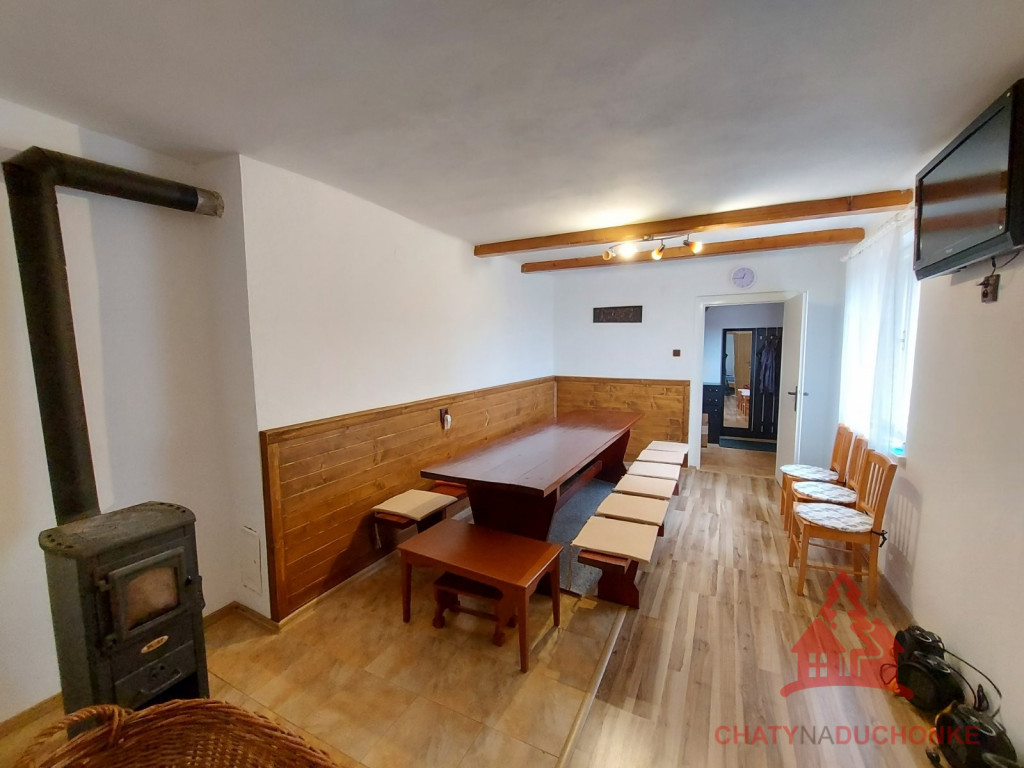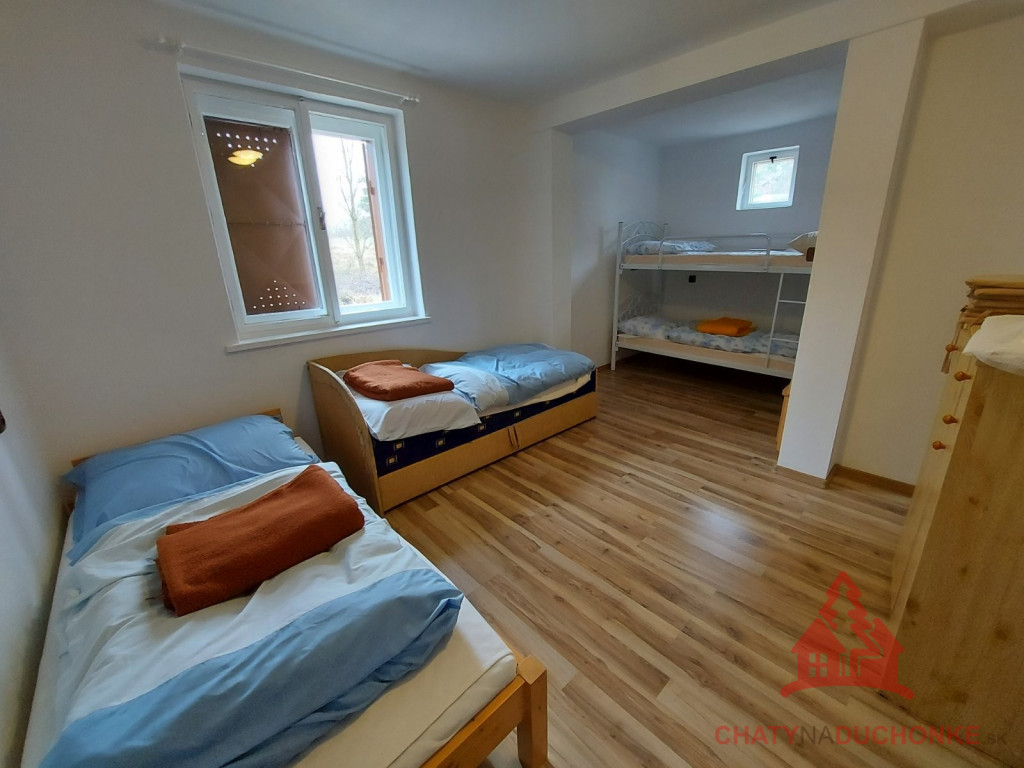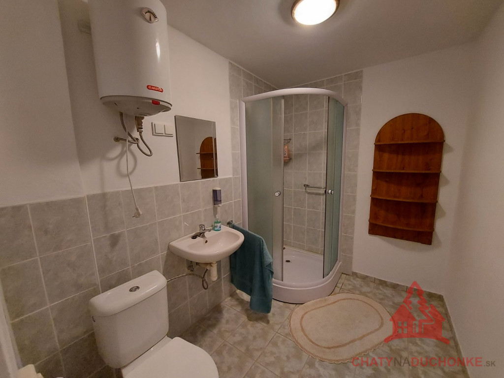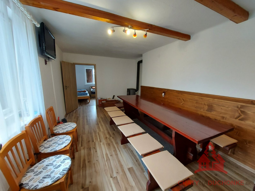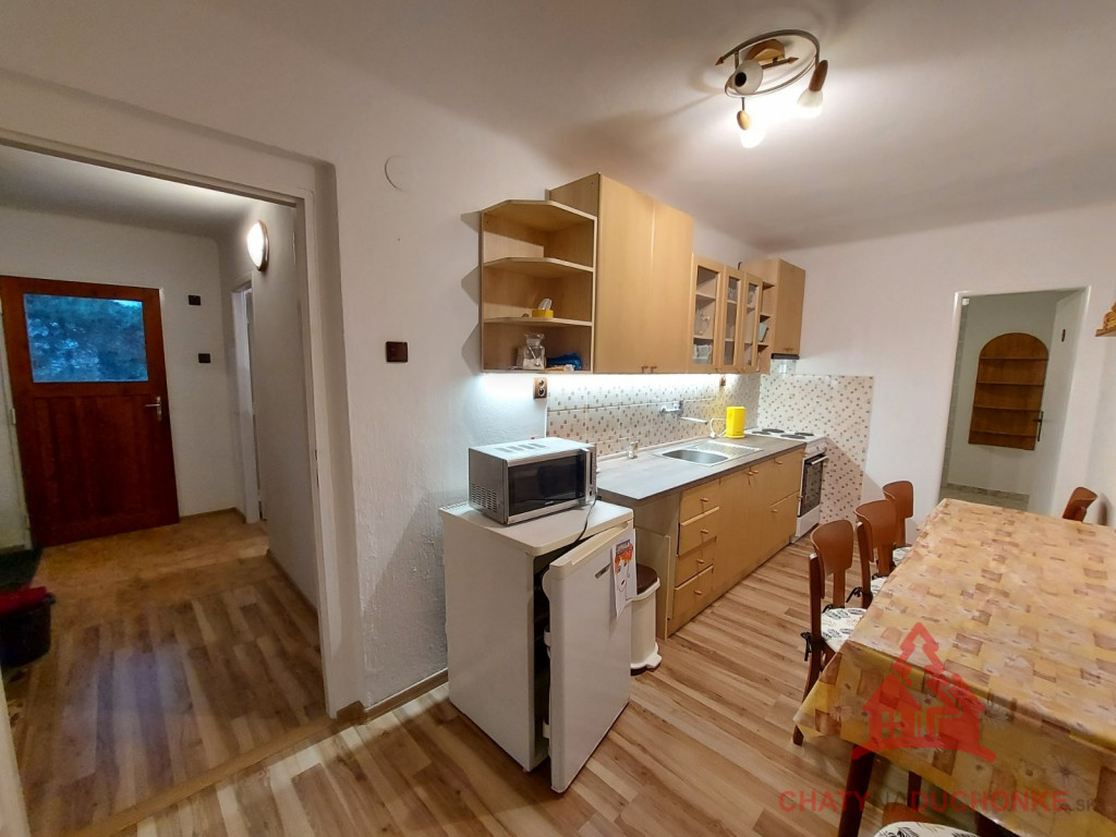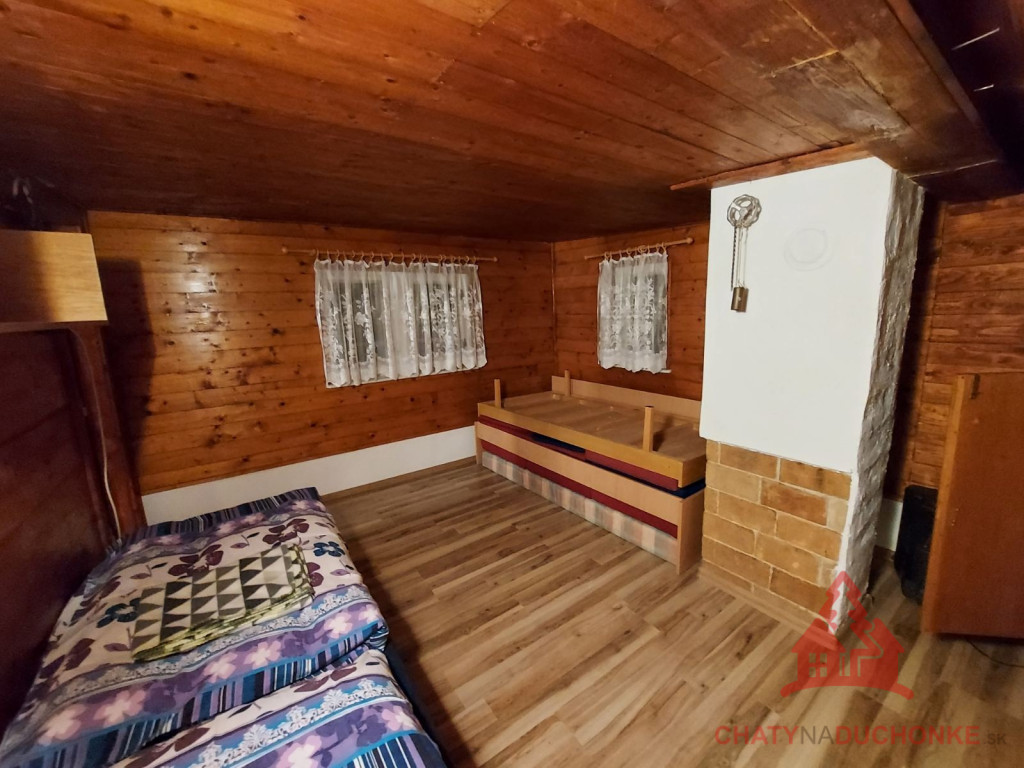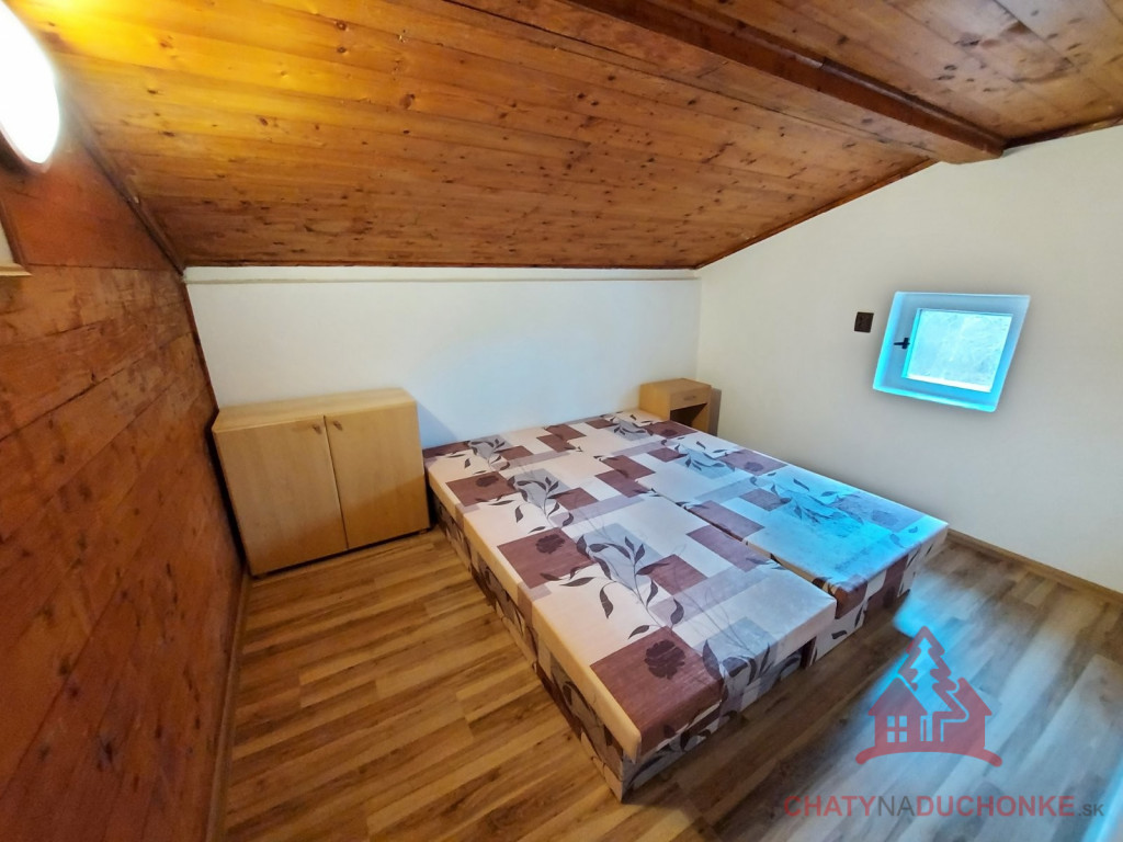 V tichej časti rekreačnej oblasti DUCHONKA ponúkame na predaj peknú, slnečnú a zariadenú poschodovú chatu s 2 terasami a garážou. Chata má 4 – izby a je plne zariadená bez investícií a ihneď k dispozícii. V prízemnej časti chaty sa cez dolnú terasu dostaneme do chaty, kde je chodba, z ktorej je vstup do spoločenskej miestnosti, kuchyne a schodmi do podkrovnej časti chaty. Spoločenskej miestnosti dominuje veľký masívny stôl s lavicami na sedenie. Ďalej v nej nájdeme TV, a krbové kachle, ktoré vedia v pohode vykúriť celú chatu v zimnom období. V tejto časti chaty samozrejme je aj kúpeľňa s wc a sprchovacím kútom, tiež kuchyňa a 1 izba so 4 + 1 lôžkami. Vybavenie kuchyne: 2x chladnička, 2x mikrovlnka, nový elektrický sporák a nové riady s hrncami. Po schodoch vstúpime do 1.podlažia, kde sú 2 izby, ktoré spolu majú 6 lôžok. Z chodby na poschodí sa ide na veľkú hornú terasu o rozmere 6 x 4,5 m. Na nej je možné sedieť, opaľovať sa alebo sa len tak zašiť pred celým svetom Chata prešla kompletnou rekonštrukciou, ktorá zahrnula: výmenu elektroinštalácie, kuchynskej linky, plávajúce podlahy + dlažba, kúpeľne, osadenie nových kachlí na tuhé palivo, vymaľovanie interiéru ako aj vonkajšej fasády, nové ríny a pod. K dispozícii je: drevo, záhradné náradie, el. gril, wi-fi. V chate je zavedený vodovod, odpad je zvedený do žumpy. Ohrev vody zabezpečuje nový elektrický bojler. Zastavaná plocha chaty je 89 m2, úžitková plocha je cca 200 m2, garáž má cca 30 m2 a výmera pozemku celkovo 291 m2. Vrelo odporúčam, krásne prostredie, ešte krajšia chata, tichá lokalita a predajom je chata ihneď k dispozícii. Je vhodná ako na súkromné účely, tak aj na prenájom. V cene je zahrnutý - kompletný právny servis - vypracovanie Kúpnych, nájomných a iných typov zmlúv - právne poradenstvo - popredajný servis / zmeny u dodávateľov elektriky, plynu a vody/ a samozrejme bezplatné poradenstvo pri vybavovaní hypoúveru. Sme členom NARKS. Obhliadku dohodne: Boris HANKO, tel. 0915 702 177