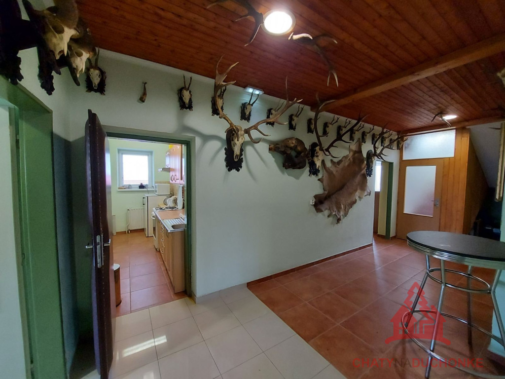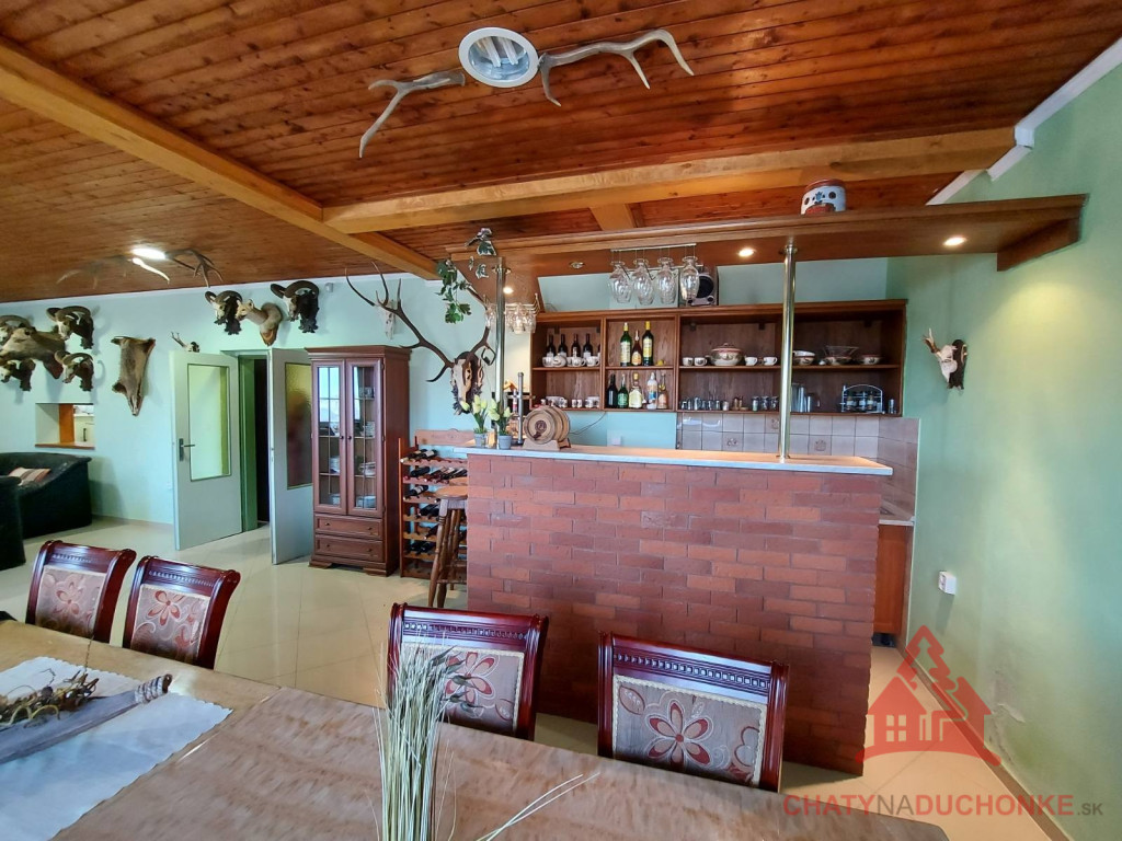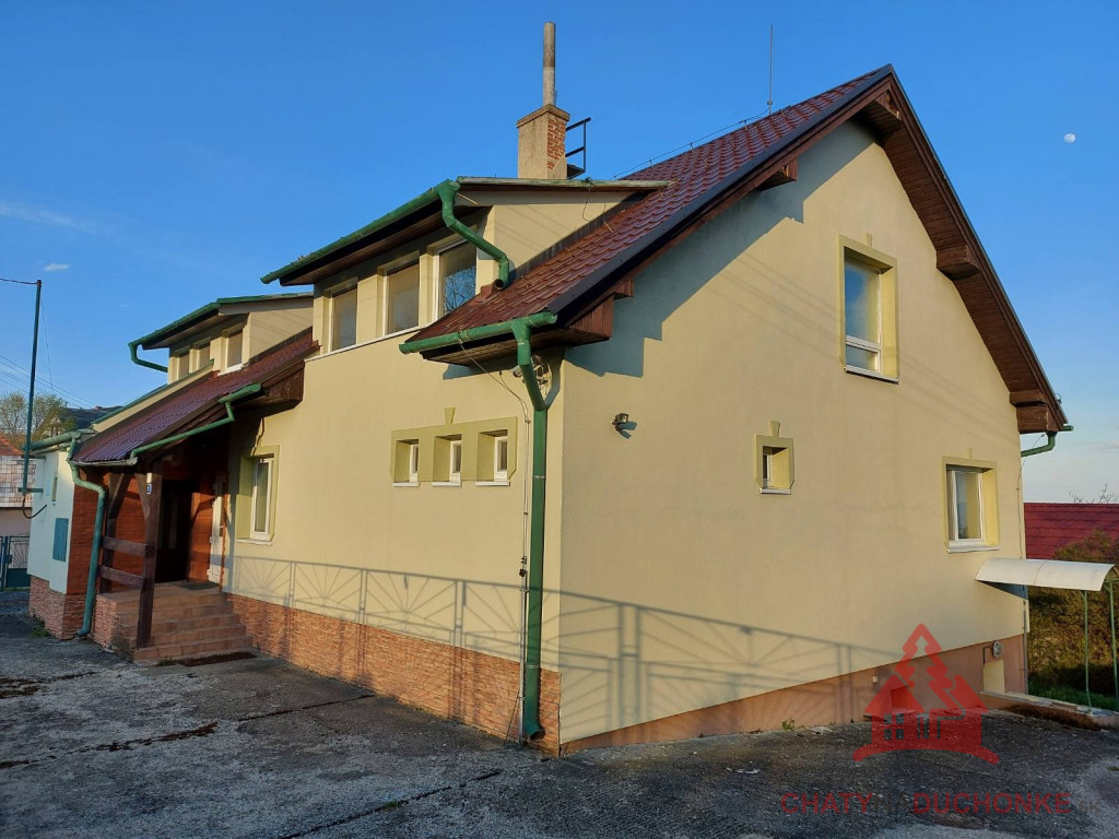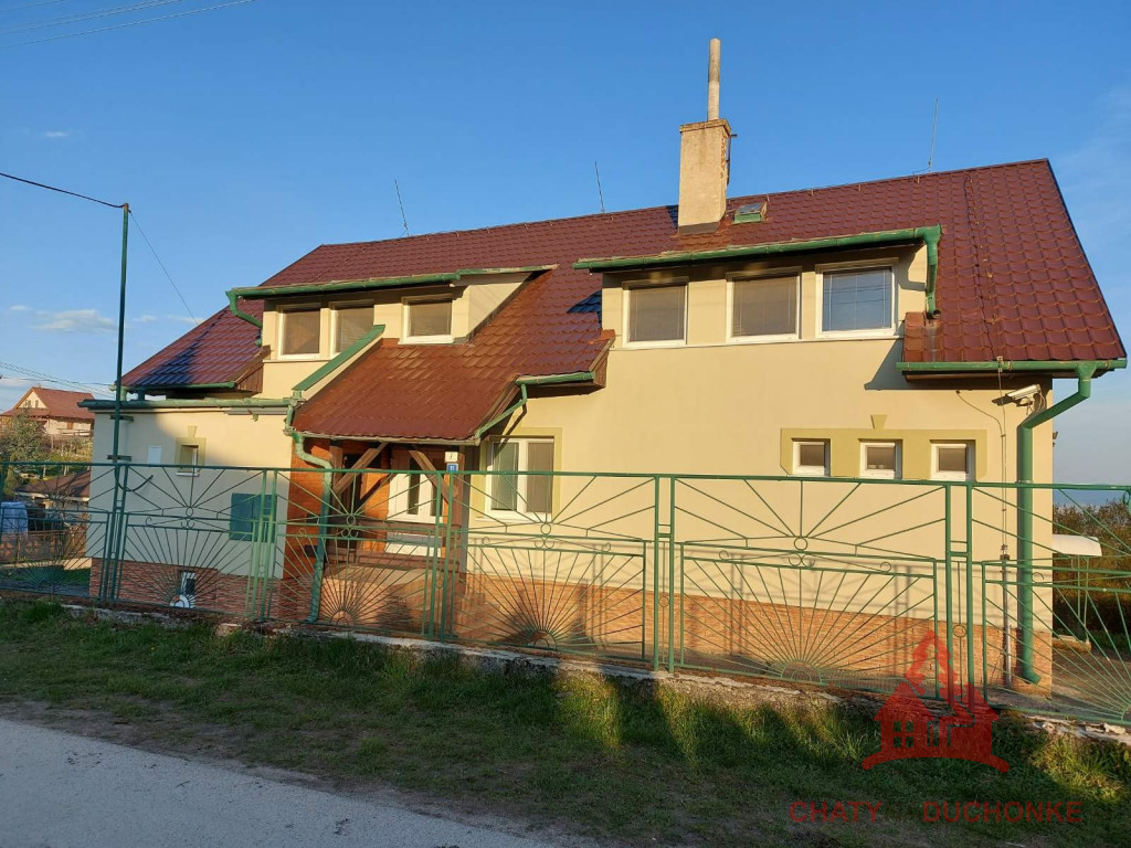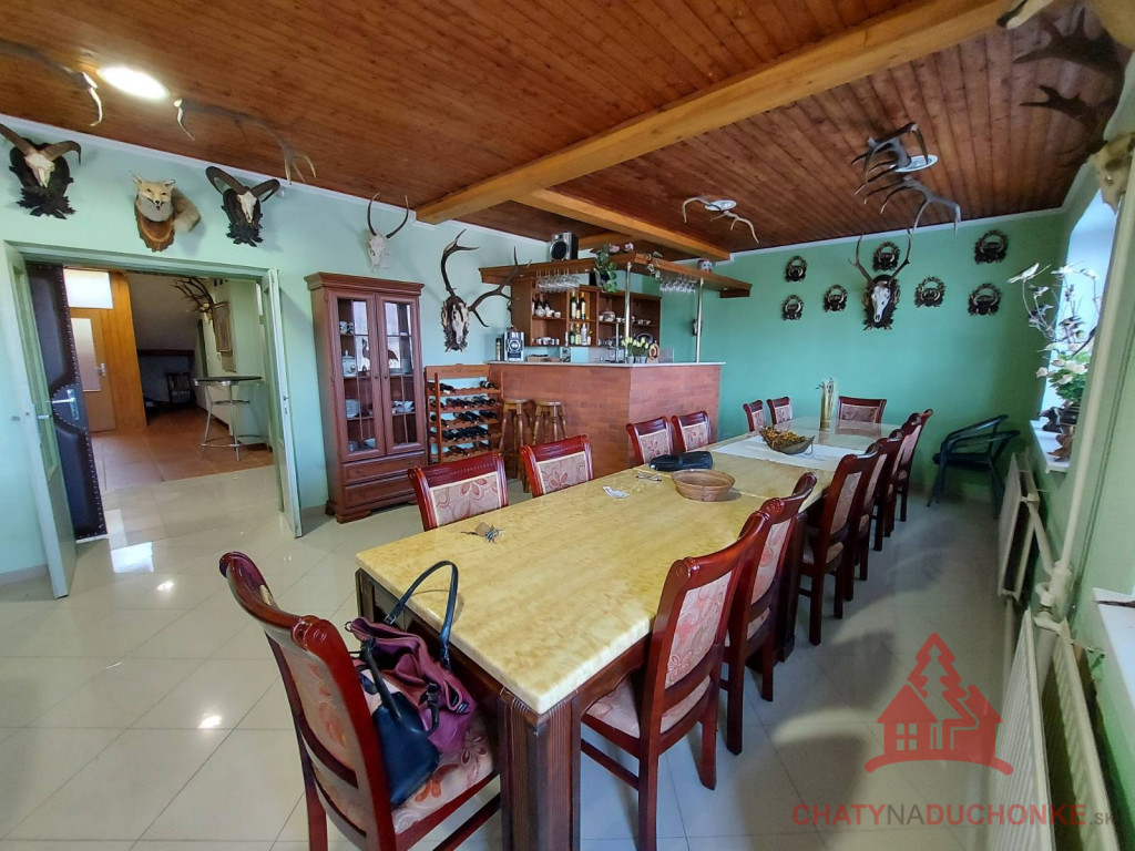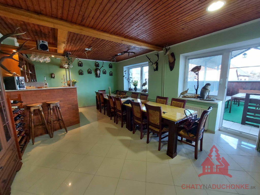 Pár kilometrov od rekreačnej oblasti DUCHONKA (okres TOPOĽČANY) ponúkame na predaj pekný PENZIÓN, ktorý je situovaný kúsok pod Topoľčianskym hradom s nádherným výhľadom na okolie. V prízemnej časti sú 4 izby čiže veľká spoločenská miestnosť s barom a krbom a tiež východom na terasu. Ďalej apartmán (obývačka + spálňa s wc a sprchou), a potom len izba s wc a sprchou. V prízemnej časti nájdeme aj kuchyňu s plným zariadením. Na poschodí je 8 izieb z toho 3 s wc a sprchou, 2 len s wc a 3 bez príslušenstva (viď foto a pôdorys). Sumár informácií: 12 izieb 18 postelí + prístelky komplet rekonštrukcia ihneď voľné nové ústredné plynové kúrenie vodovod áno odpad žumpa plyn áno alarm áno pozemok 1118 m2 úžitková plocha 400 m2 podivničené z 1/4 k nehnuteľnosti prislúchajú 2 garáže plastové okná zateplené 230/380 V Podotýka sa, že poľovnícke trofeje NIE sú predmetom predaja, ako aj kožená sedačka (čierna a zelená) a tiež jedálenský komplet. Zvyšný nábytok ako postele a skrine v izbách sú súčasťou kúpnej ceny. Vrelo odporúčam, krásne prostredie, tichá lokalita a predajom je chata ihneď k dispozícii. Možnosť financovania úverom: ÁNO. V cene je zahrnutý kompletný právny servis, vypracovanie návrhu na vklad do katastra nehnuteľností a poradenstvo v oblasti hypotekárneho financovania a poistenia. Obhliadku dohodne: Boris HANKO, tel. 0915 702 177 Viac na CHATY na DUCHONKE sk